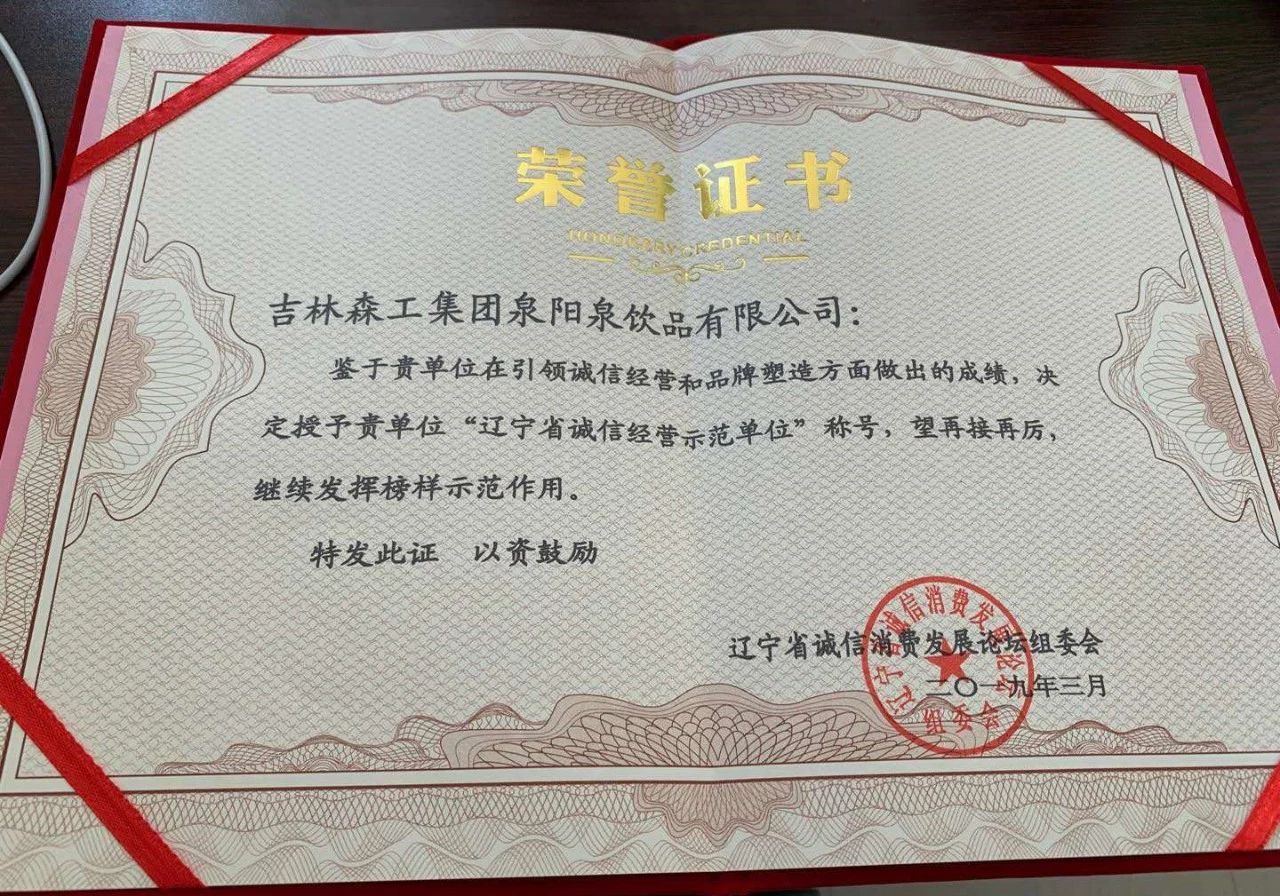 泉陽泉榮獲“遼寧省誠(chéng)信經(jīng)營(yíng)示范單位”榮譽(yù)稱號(hào)!